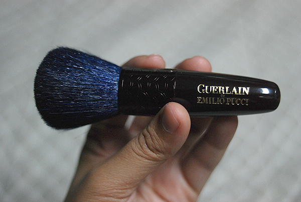 The brush itself is about four inches long, with navy blue bristles and a gorgeous metallic chocolate brown handle, stamped with the collection name and some fish-scale-y print near the bristles. It comes in a beautiful pouch featuring “Winter Capri.” The bristles aren’t soft, which honestly doesn’t really bother me all that much. Anyway, like I said, I got this brush at 50%. I didn’t have a kabuki brush yet, so I was happy to get it for my météorites, and I suppose, for other uses as well, like tickling someone’s nose.