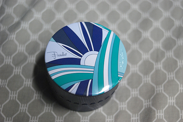The lid features both the beautiful Pucci print, as well as an engraving of Guerlain’s logotype. The tin itself is in a gorgeous metallic navy.