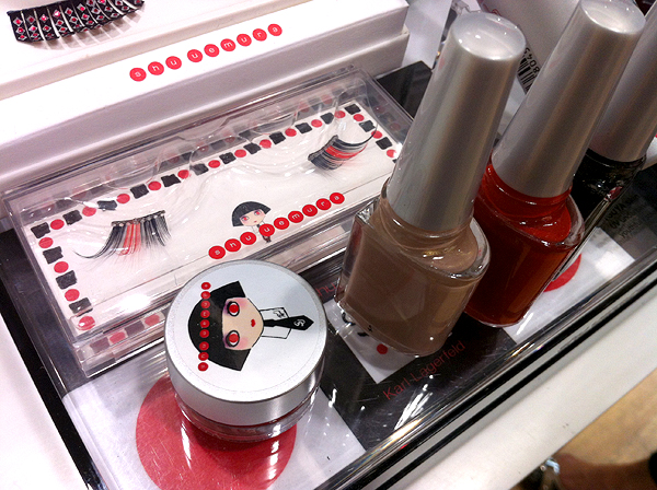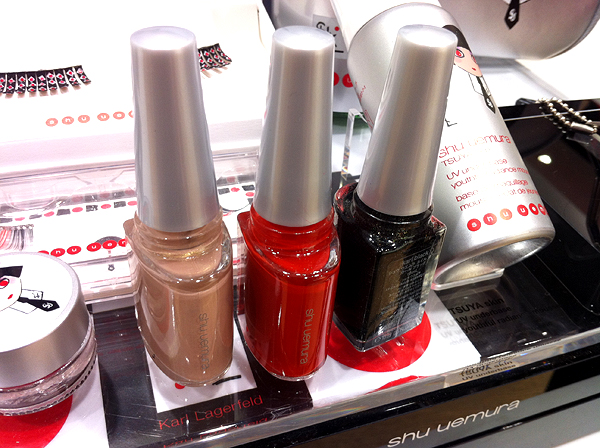 Also part of the collection are these cute mini eyelashes, painting liner (in Blackish Satin Purple), and nail lacquers. I’m not a polish person, so I can’t tell you how the formulation is, but here are the three shades, L-R: Royal Beige, Shu Shu Red, and Karl Black, which seems to have quite a bit of sparkle. If I wore nail polish, I would probably go for that one.