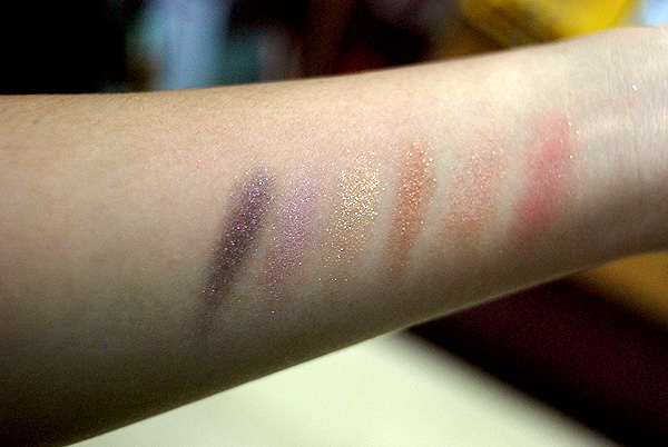 Swatches! The Silk Smooth eye shadows (richer, more pigmented color, and that fricken’ beautiful texture) are the first and third shades. In between are the eyeshadows: a shimmery lilac, a gorgeous gold great for highlighting, and a warm, desaturated peach satin shade. Lastly, there is the sole blush color, which I would actually look great as an eyeshadow.