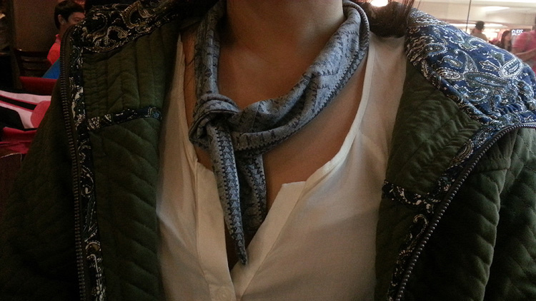 HA! The title has misled you, I know. This is not a Halloween costume, obviously. I had to put on a workday-on-Halloween outfit because I had scheduled meetings and work dates on the last day before the long weekend. I made the mistake of wearing this shirt, because I forgot how cleave-y it could be, distracted by how soft it is. However, this scarf (though actually a headband) was one of the better decisions I made that day.