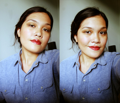 I wish I could have made it warmer and bluer, but I wanted to incorporate a bit of blue in the eye makeup. What happened instead was I got a sort of hazy, patchy gradient of blues, greens, and yellow-browns on my lids. I used a muted blue to line my eyes, and a strong red lip to stand out, like the red on the French flag. There’s a tiny, tiny bit of contouring with the bronzer, to keep my face warm, and a hint of peach-pink flush—like Liberty’s, though not as pervasive on my face as it is on hers. After all, I’m not out to win any revolutions or anything like that, after all.