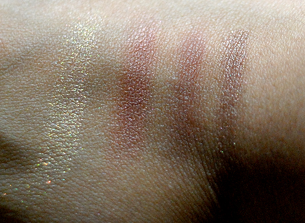 Turandot features a light yellow-orangey gold (good for a base, highlighting and contrast), a pinkish rust with a slight satin shimmer (a shade, I presume, intended for the lid), a matte brownish plum (for creasing and contrast), and finally a slightly frosty brown with plum undertones (for creasing, contrast, and definition).