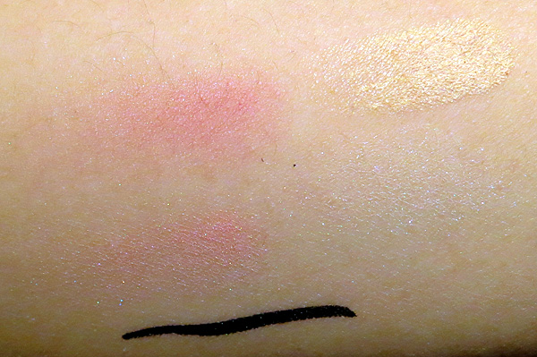 This is a swatch of the Edie Set (Php 4250), which has a nude matte lipstick (top right), a blush duo (left shades), a small powder shadow (bottom right), and a liquid liner, which is the most impressive performer of the bunch. The lipstick’s described as a “60s nude pink,” but it really looked void of any pink tones. The shadow applied quite translucent on my skin, and the blushes don’t give much for contrast. The eyeliner is really gorgeous, though.