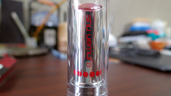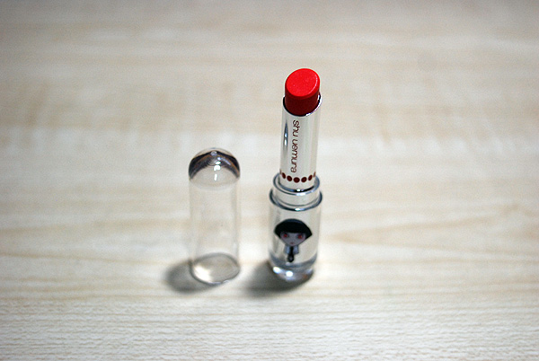 The top half, where the transparent cap goes, has the Shu Uemura logo on its silver body, with a bunch of red dots circling the perimeter. I love Shu Uemura’s transparent caps on lipsticks because it’s very very easy to tell what lipstick you’re reaching for with just one look. As for the bottom half…