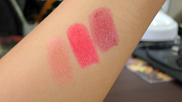 All three swatched together, L-R: Celebrity Beige, Mon Shu Red, Luxe Burgundy. I’m fighting the urge to get the last shade, Parisienne Pink, just so this picture of swatches is complete.
