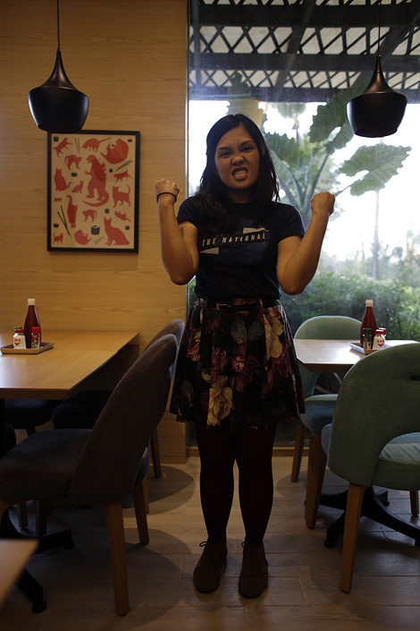 My shirt is from The National’s Singapore show—Awwww yiiiiisss! The skirt is from Primark for £7 or something—Awwwww yiiiiiisss! The tights are also from Primark, and my shoes are my favoritest pair of suede Desert Grace chukka boots from Clarks. Awwwwww yiiiiiis!