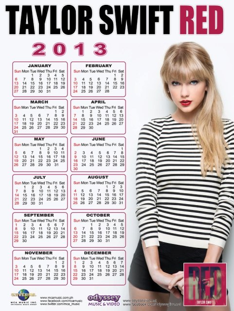 Overall, it’s a great lipstick and I’m glad my sister bought it. I don’t know if it’ll get a lot of wears from me, but maybe when I can put it on on days that I need to feel a little bit older! Funnily enough, my sister told me that I reminder her of Taylor Swift in stripes and red lipstick when I tried this on. Here’s a calendar I filched from her site, for reference: