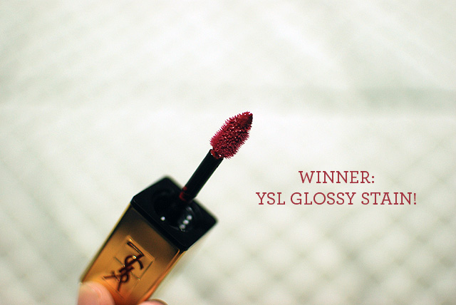 Winner: The YSL Glossy Stain, for a less offensive scent.