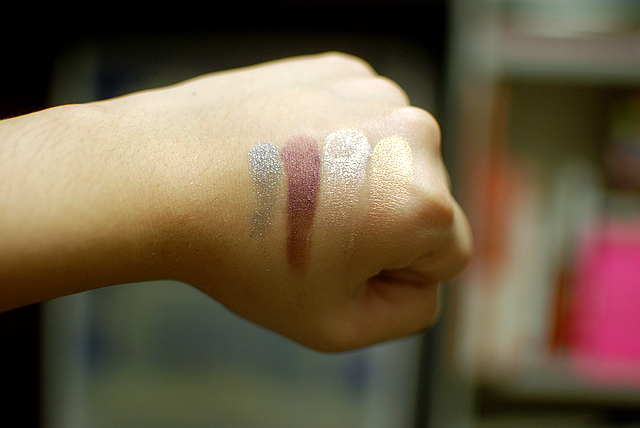 Swatches, L-R: Buxom Stay-There Eyeshadow in Pug, Benefit Creaseless Cream Shadow in Stiletto, Stila Smudgepot in Kitten, MAC Paint Pot in Rubenesque