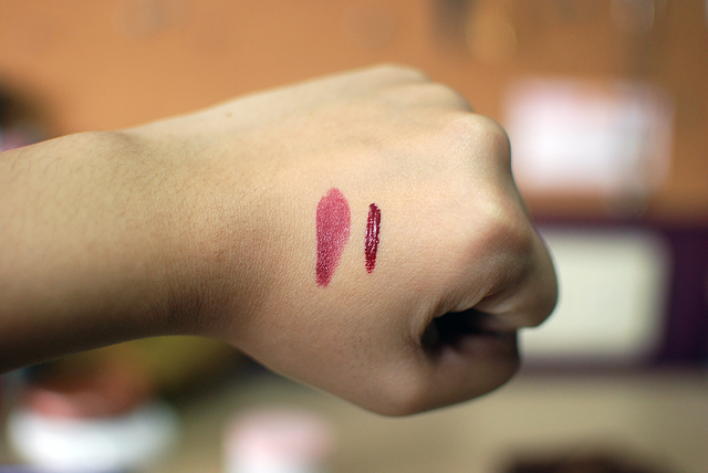 Swatches, L-R: Addiction by Ayako Color Lipstick in Lady of the Lake, Guerlain Rouge G L’Extrait in Orgueil