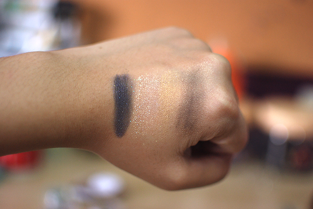 Rebellion is an utterly beautiful black shadow with dark blue shimmer and sparkles. Baker’s Boy is a very pale, warm light brown with light blue sparkles and I use it as a base. Remake is a golden bronze with fine lavender glitter. I feel like this needs to be layered on to get the full effect. Finally, Star-Crossed is a blackened coppery-brown. The shadows are utterly beautiful and my crappy swatches do not show them in the most flattering light.