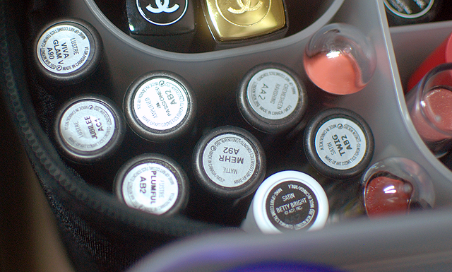 My two shu uemura lipsticks are from the Karl Lagerfeld collaboration: Luxe Burgundy and Celebrity Beige. And then, this lone Make Up Store lipstick in Redwood rests on top of the other lipsticks because I have no room for it. D: