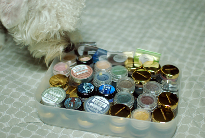 I thought about not showing my mineral eyeshadows because it’s a little embarrassing, but in the interest of transparency and honesty, here is the mother lode, complete with a nosy puppy: