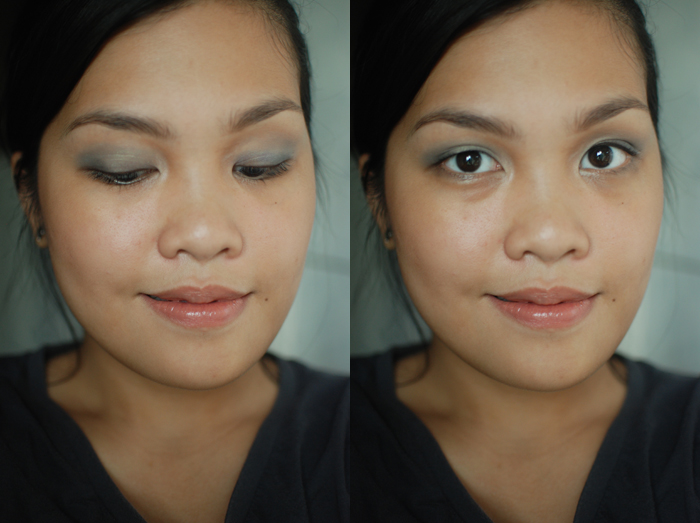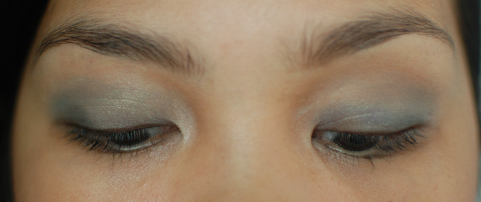 I made a soft crease gradient with bM’s Satin Mist, which is a sort of light silver grey, with very slight, imperceptible shimmer. It’s pretty matte, actually. Then I patted on Nestyr on the inner two-thirds of my eye. Lingered in Twilight was blended into Nestyr from the outer third of the eye, and then smudged along the outer half of the lower lash line.