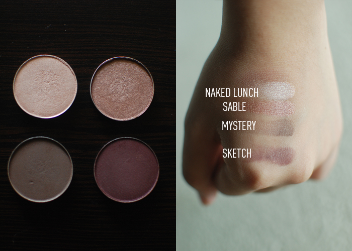 Look 1: Naked Lunch all over the lid, Sable on the center, Sketch on the outer corner, and Mystery lower lash line. Look 2: Sable all over the lid, Sketch on the outer third and lower lash line.