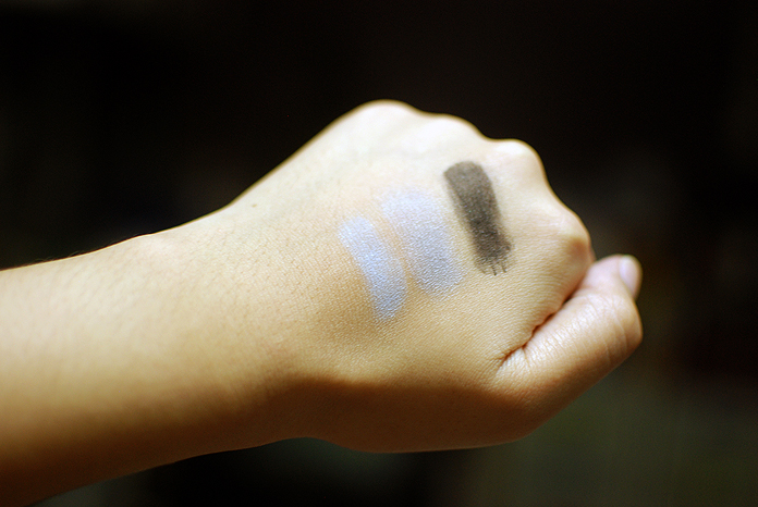 Here they are, swatched in order. There isn’t much contrast between the pale blue and the silver. They are nearly identical, with the silver being a bit lighter and having more of a purple tone to it, than a blue. The black is pigmented, though chalky.