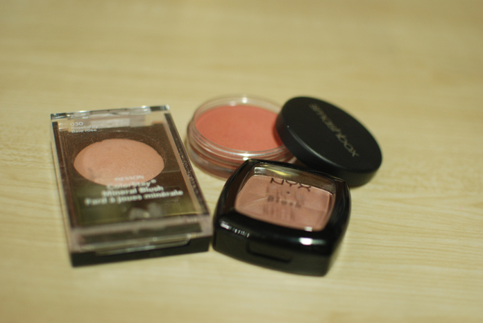 CHEEKS — from my Project 10 Pan: Smashbox Whipped Blush in Dusty Rose and Revlon ColorStay Mineral Blush (Roseberry). Plus, a more neutral but oft-neglected choice: NYX Powder Blush in Raisin