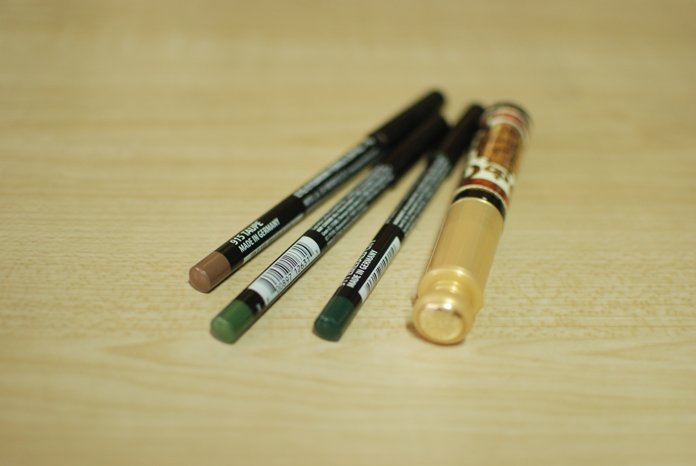 EYE STUFF — NYX Eyeliners in Moss, Emerald City, and Taupe. Majolica Majorca Lash King Mascara