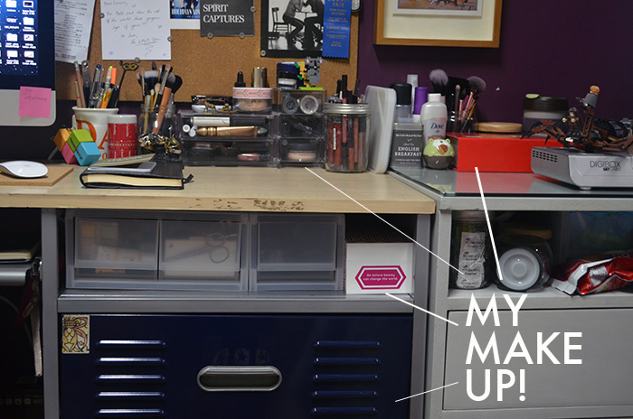 I want to do some sort of storage video/post one of these days. I currently keep my makeup on my work area, with a deep-ish drawer and a cubby for storage for “extra” makeup that’s not on my tabletop. It’s a little hard to explain, so here’s a picture: