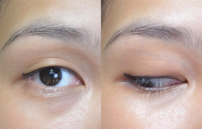 The packaging is a hit-or-miss for me, though I suppose it’s good for travel. While I don’t like the complicated, unbalanced shape (wide at the bottom, super narrow at the top), I do appreciate that the narrow end is a built-in applicator. It’s quite a good one, too. If you recall, I have uneven eye folds, so I use the thicker, flat end of the brush to line my right eye. The thin, skinny side is for the left eye. 🙂 The handle extends a little bit, too, so you can have a better grip of the product.