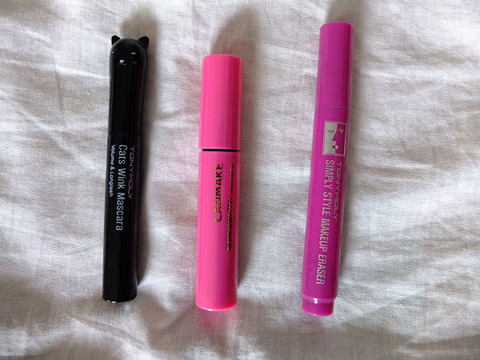 I use a Shu Uemura eyelash curler, but it’s not in the photo because it’s old and not at all photogenic, haha. For mascara, I’m partial to comb applicators but this Tony Moly Cats Wink Mascara is not bad! I’m finishing it so I can try the Canmake one. The Tony Moly Makeup Eraser is the best thing ever. Sometimes I get a bit of mascara on my lid and just a quick swipe with this pen and it’s gone!