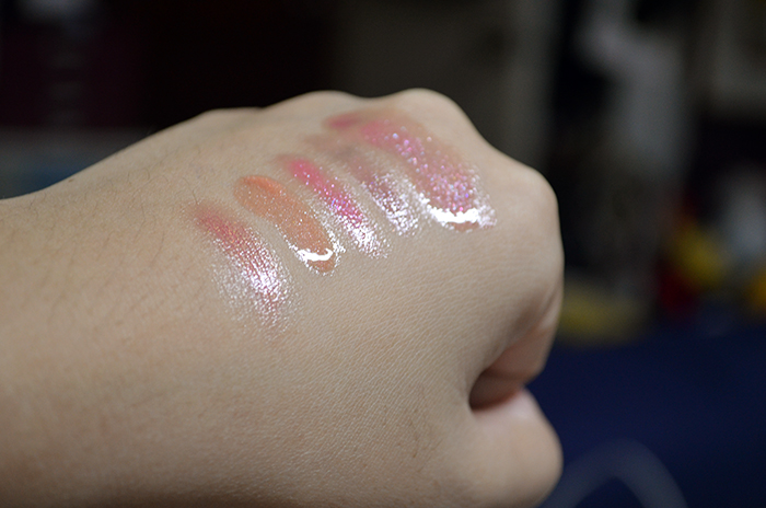 There are very subtle variations regarding the colors. I personally believe they work better over another color, as a sort of pretty cloak over something more opaque. On bare lips, you can hardly tell the difference unless you are a really observant person. Though the shimmer content and variation are more obvious in real life, I think that it’s not enough to justify the price of this lip kit.