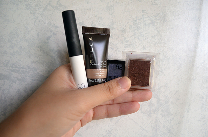 For eyeshadow, I decided to leave palettes and bring two singles: shu uemura eyeshadow in ME medium brown 885 and Art Deco 82, a blue. I also have a BECCA Eye Tint in Baroque, which is just super sheer, and a travel-sized NARS Pro-Prime Smudgeproof Eyeshadow Base, which is not my favorite, but it’s very small.