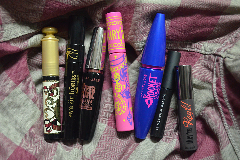 L-R: Majolica Majorca Lash King, Eye of Horus Natural Mascara, Maybelline The HyperCurl, FairyDrops Volume Burst, Maybelline The Rocket, Le Métier de Beauté Anamorphic Lash, Benefit They’re Real!