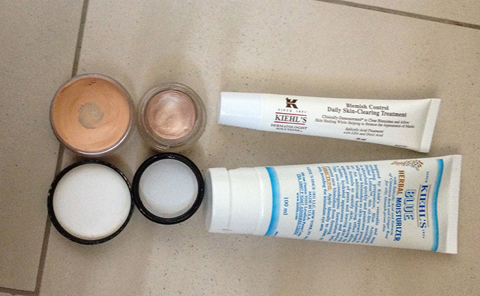 Trick to making your makeup last longer—use a good base. I have MAC Bare Study and MAC Eye Prep + Prime here. I have Kiehl’s Blemish Control Daily Skin-Clearing Treatment and Kiehl’s Blue Herbal Moisturizer on the top, which I massage into my face about five minutes before starting on makeup.