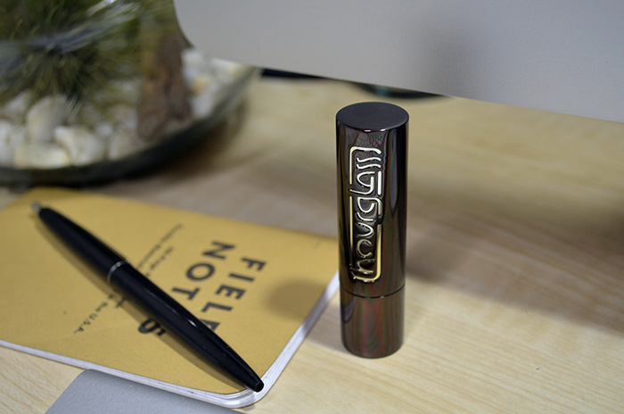 The lipstick cartridge is very pretty, with a substantial weight to it. I love the cover, too, which sort of just slides into place. It’s not magnetic or anything, and there’s no ‘click’ to it. It just slides into place and it feels so sleek, especially with the shiny chocolate brown chrome exterior. I love the logo, debossed with gold, and the hourglass shape stamped onto the lipstick. I think it’s safe to say that I’m a fan.