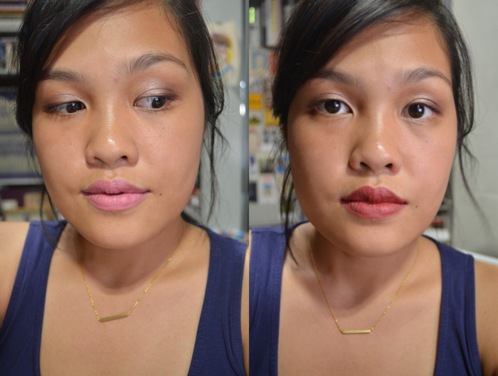 I’ve chosen a super pale shade that’s not brown/neutral on the left, which is Rimmel x Kate Moss Matte Lipstick in 101. On the right, I chose a dark neutral matte lip, Revlon Matte Lipstick in Fabulous Fig. The lip liner is not detectable on both cases either.