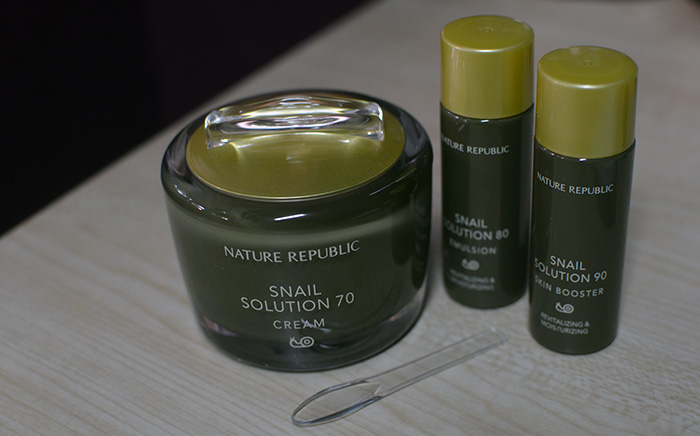 I know that snail secretion in skin care is so 2010, but if it’s been around this long, there must be some merits to it, right? I got to try some items from the Nature Republic Snail Solution line, namely the Skin Booster, Emulsion, and Cream. They’re to be used in that order.