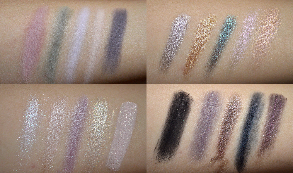 L-R, swatched: Silver Dollar, Ginger Sugar, Violet Spell, Golden Pear, Strawberry Mousse