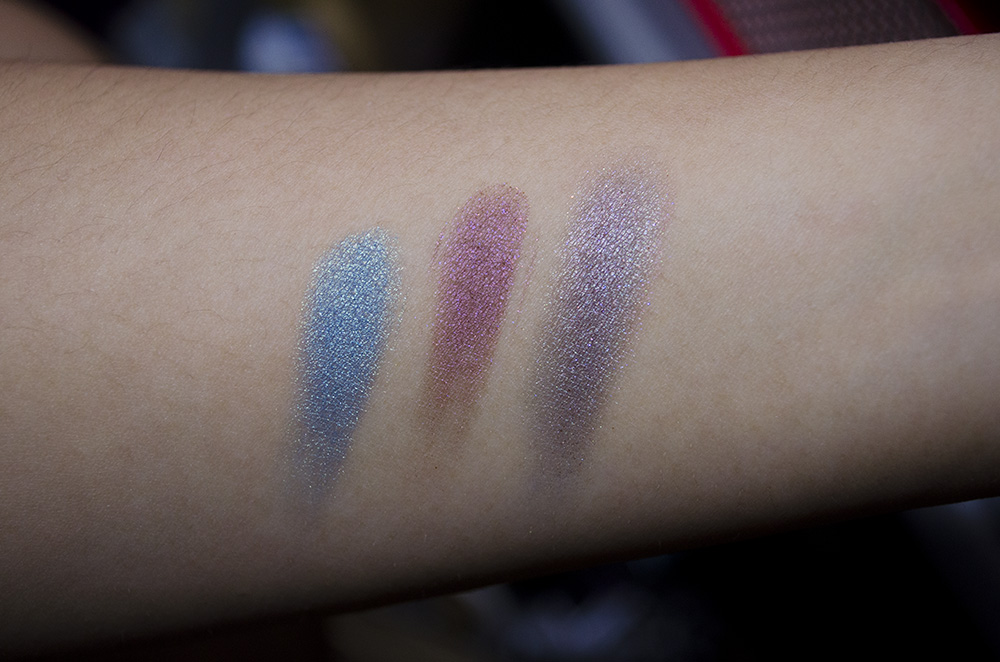 I didn’t expect to pick up the other duo—China Seas—but I ended up doing so, and boy am I glad. NARS describes this duo as an “Iridescent turquoise with gold infusion” and an “Iridescent plum.” Judging from this description, I expected to be absolutely floored by the blue shade, alas I was not. It’s a pretty turquoise, but I don’t see much gold in it. The plum, on the other hand, has a smattering of cool blue/violet sparks in it. It’s so freaking pretty, I swear.