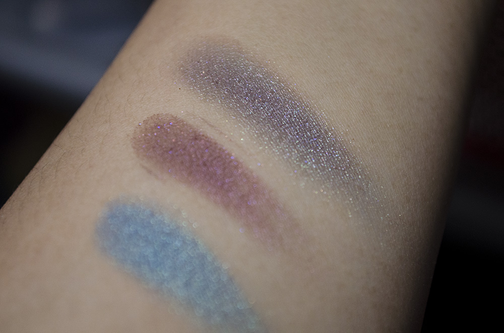 I can’t get over the smattering of blue sparks all over! I wore this layered on the lid with the plum on the outer corner, crease and outer half of the lower lash line, and the blue on the inner half of the lower lash line.