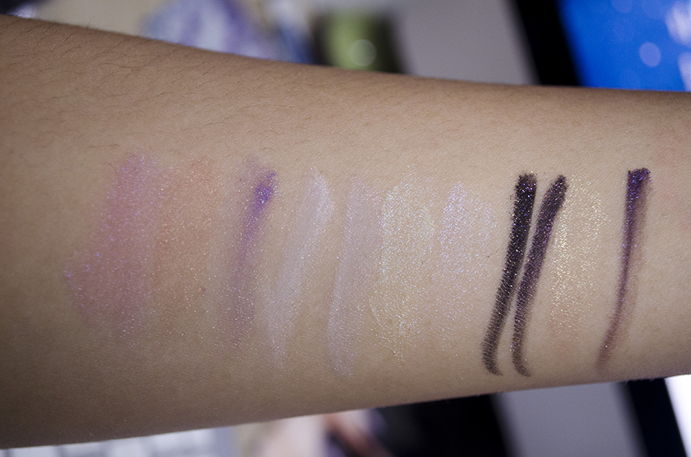 Here are some swatches, over bare skin. I used a Q-Tip so the swatches are skinnier than usual. I also grouped them according to type, and then collection: