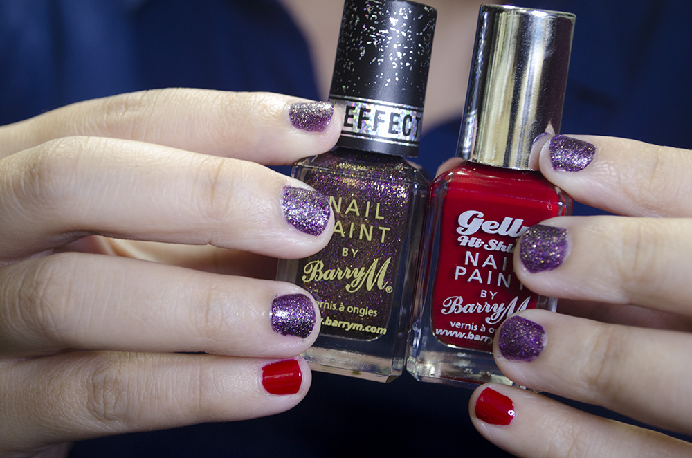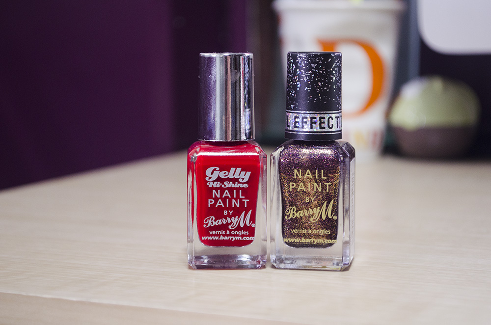 I got these awesome Barry M nail paints from my swap with Laala! I had never tried them out before, but I always see them in blogs, since I follow quite a few UK-based ones and everyone seems to love these. Laala says that these are probably her favorite nail polish formulas, after Chanel, and that sounds pretty freaking awesome to me. She got me a red shade (Blood Orange) from their Gelly line and a super freaking pretty glitter/textured shade (Countess) from a limited edition collection called Royal Glitter. Anyway, it is beautiful. It looks brown in the bottle, but on the nails it is a magic color.