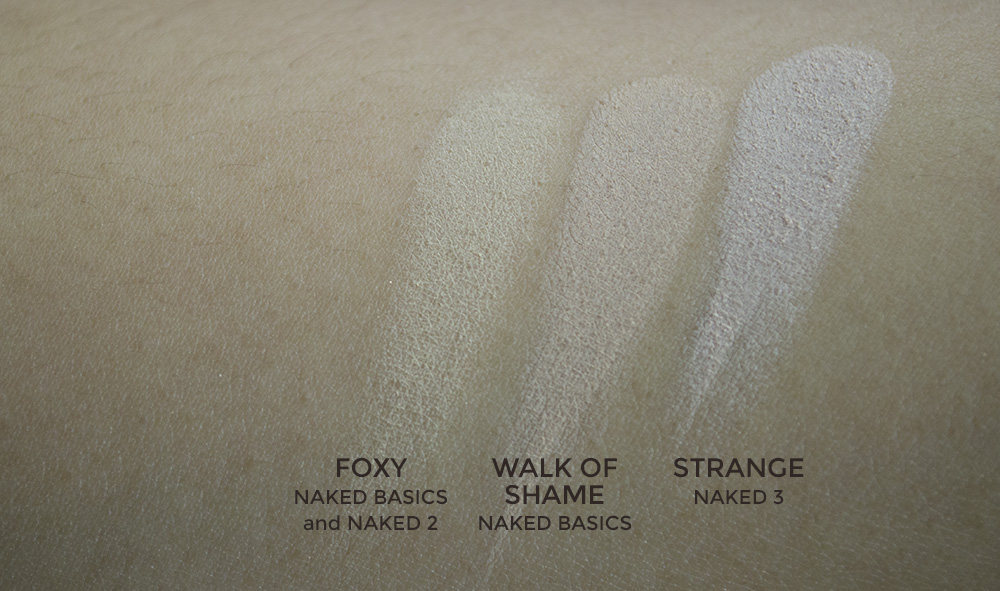 Foxy is yellow-toned, Walk of Shame is a bit peachy, Strange is pink-tinged.