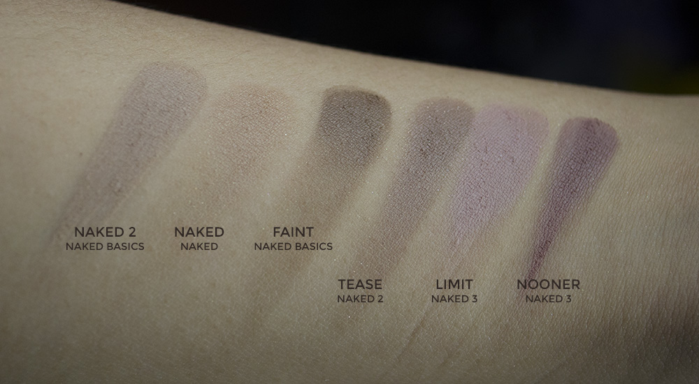 Naked 2 is a very neutral midtone brown, Naked is a pale brown that’s closest to my skintone, Faint is a neutral greigey brown, Tease is mauve-y midtone brown, Limit is a neutral pale mauve with a strong purple tone, and Nooner is a very muted and neutral midtone purple.