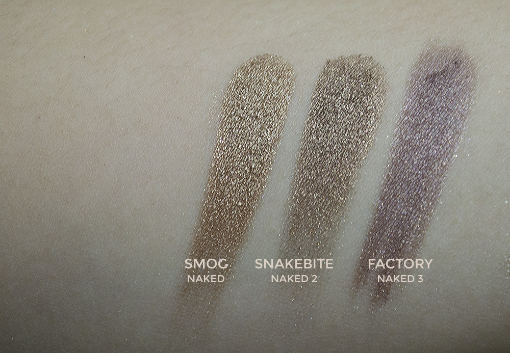 Smog is warm and golden, Snakebite has gold in it as well but is a bit more neutral and less warm, Factory is a neutral brown with a strong rose undertone.