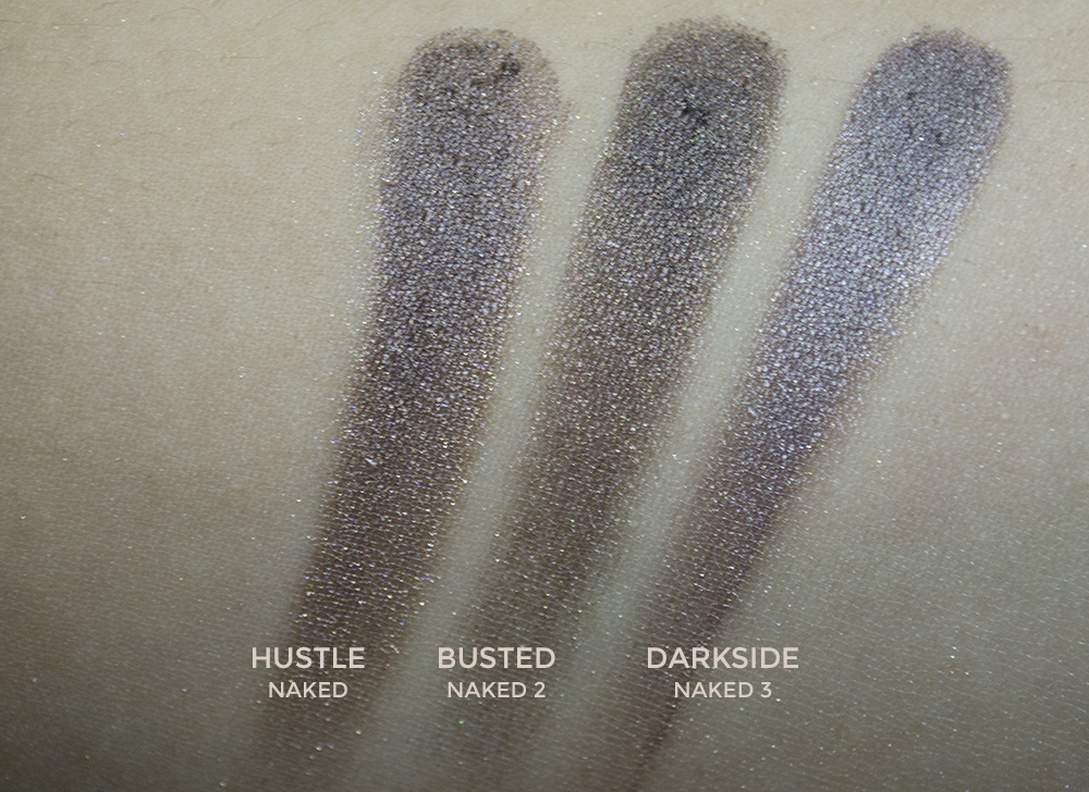Hustle is a purple toned frosty taupe, Busted is kind of a deeper version, and Darkside is similar but is heavy on the grey tones.