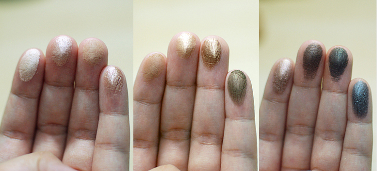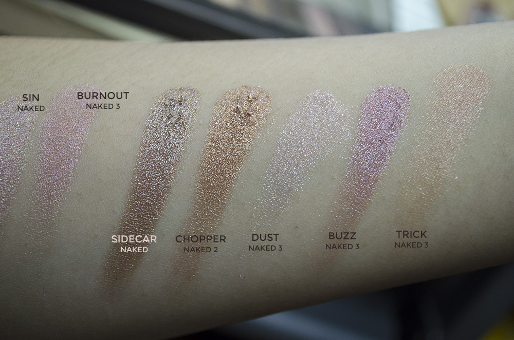 Sidecar is a beautiful pinky brown that has tons of fallout, Chopper is a more coppery and warm, Dust is a cool pale pink and applies a little patchy, Buzz is a beautiful frosty medium pink, Trick is a rosy copper.