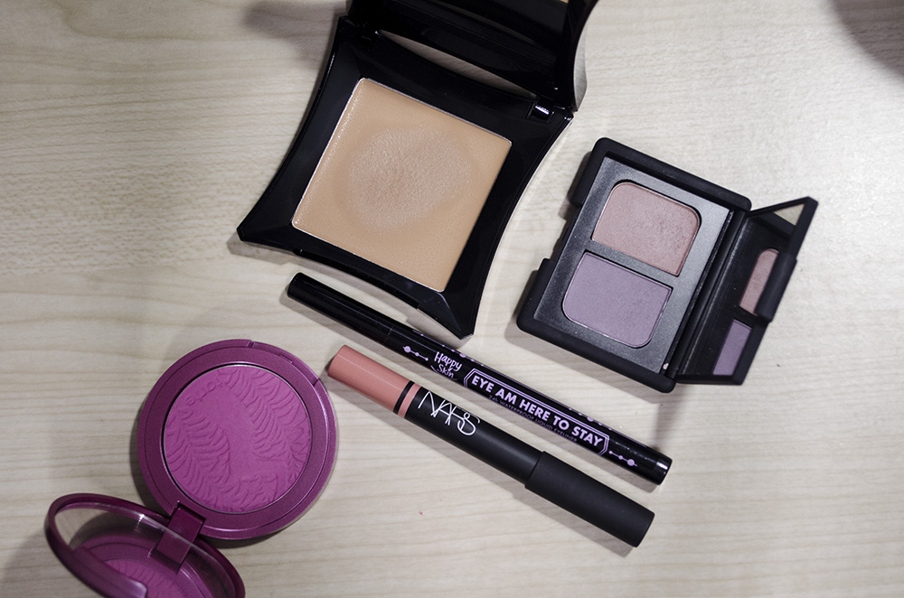 I basically just used the NARS Eyeshadow Duo in Charade—the rosy shade all over the lid and the purple to deepen the outer corner and smoke out the lower lid a little bit. I used a bit of the rosy shade as a gradient, too. I used a liquid liner and mascara, and that’s mostly it for the eyes.