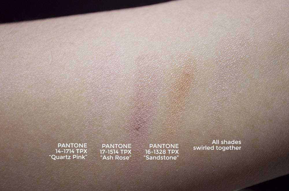 The blush/bronzer side is made up of a blush in Pantone 14-1714 TPX or Quartz Pink (the biggest pan), a deeper dusty pink bronzer/blush in Pantone 17-1514 TPX or Ash Rose (the medium pan), and a strip of a warm brown in Pantone 16-1328 TPX or Sandstone. The shades are all shimmer-free, and would probably suit pale to medium skin tones.