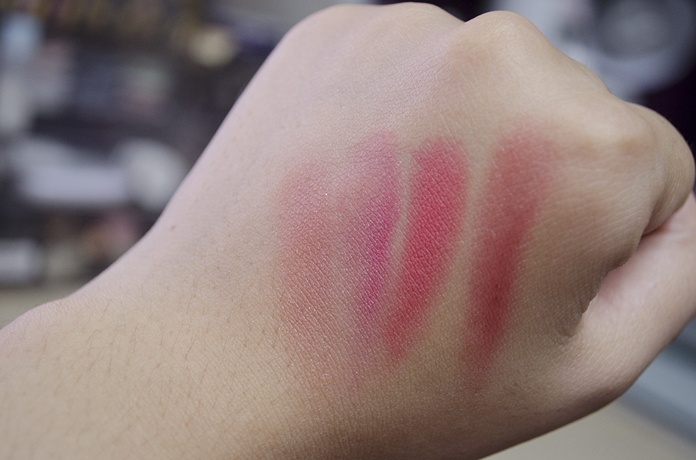 Swatched, L-R: MAC Extra Dimension Blush (Fiery Impact), Tarte Amazonian Clay 12-Hour Blush (Natural Beauty), NARS x Pierre Hardy Blush (Boys Don’t Cry), Canmake Cream Cheek (CL01)