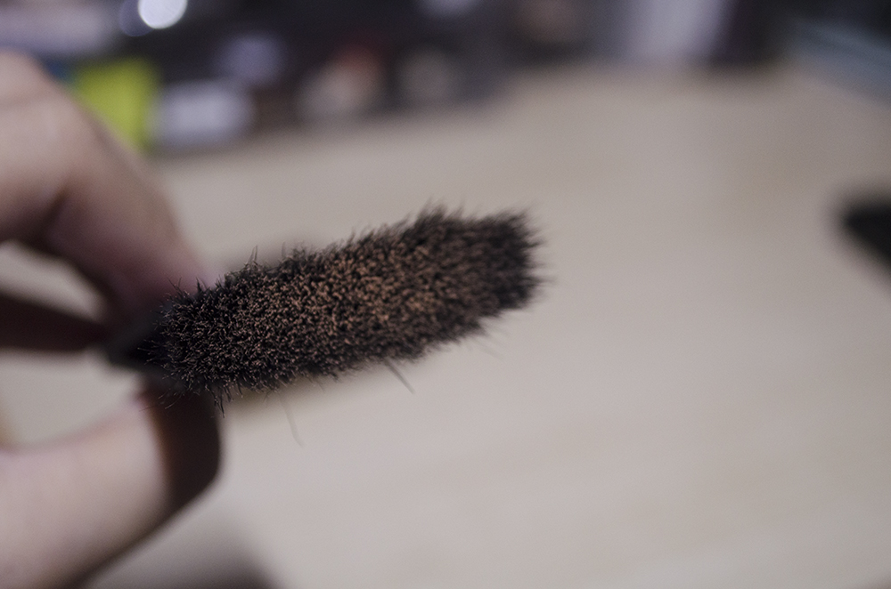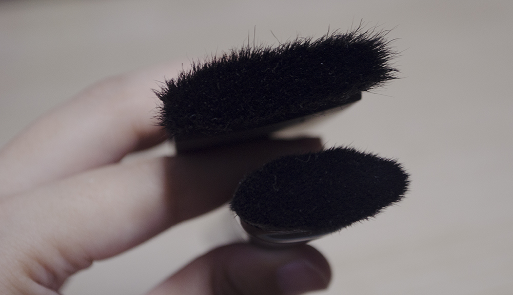 Here’s what they look like, structurally. The Ita brush is comprised of a rubbery matte plank that forks into two planks that sandwich the bristles (the ferrule is black). The Blush Up brush is a bit fan-like but super dense with a shiny black ferrule and handle.