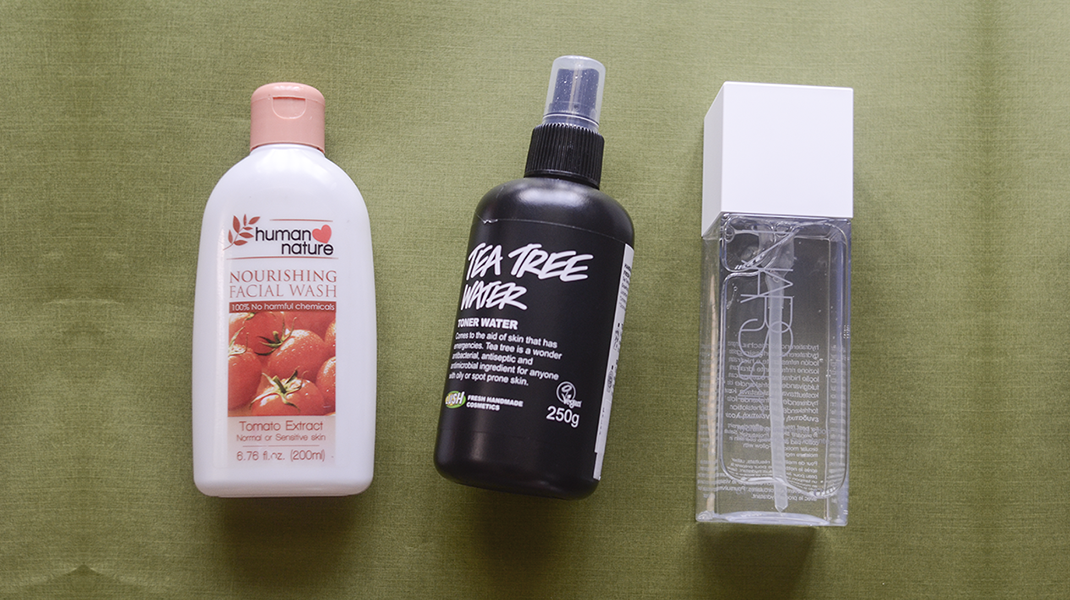 My facial wash of choice is the Human Nature Nourishing Facial Wash, which is for normal or sensitive skin. I’m on my second bottle. I used to use the Moisturizing one (with moringa extract, I think) for dry skin, and that worked better for me, but it smelled like crap, so I’m on this one. And it works well enough!