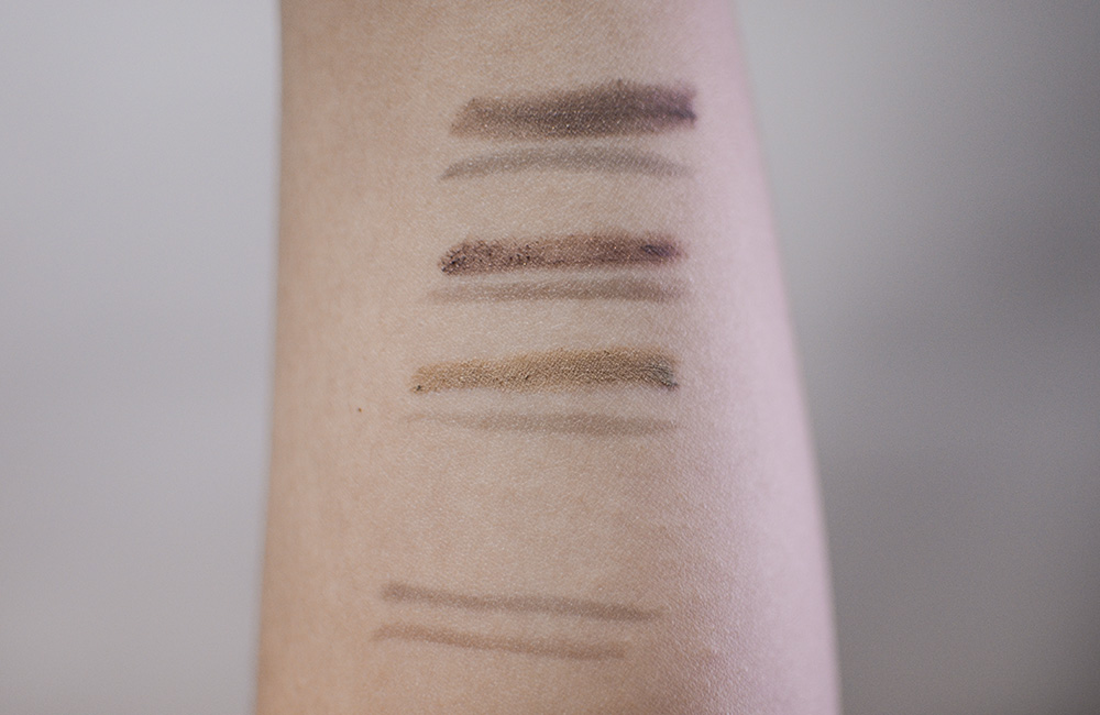 Swatches, Top to Bottom: K-Palette 24H Real Lasting Two Way Eyebrow Liner in G101 Grayish Brown*, 102 Natural Brown*, 101 Light Brown*; K-Palette 24H Real Lasting Eyebrow in 02, 01