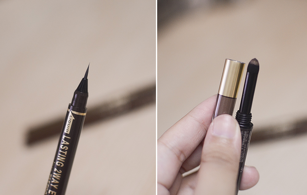 The 24H Real Lasting Two Way Eyebrow Liner* is pretty close to my usual eyebrow routine. Usually, I draw over my natural eyebrow shape with the K-Palette eyebrow markers then run through them with a brow powder and an angled brush. In this unique contraption, there is a marker on one end, and a vial of brow powder and a sponge-tip applicator on the other end.